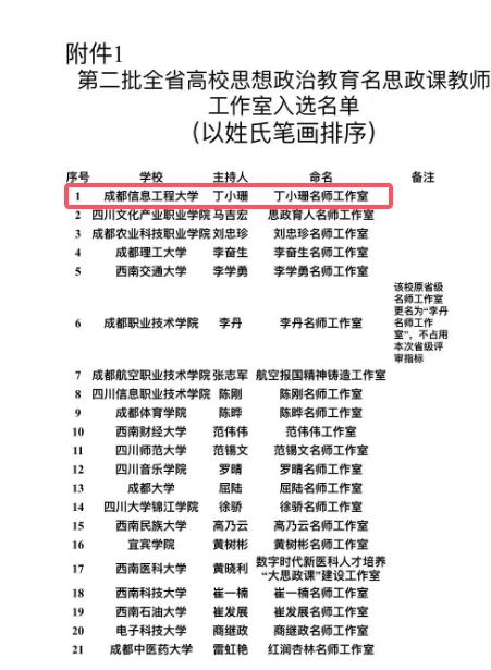 在近日公布的第二批全省高校思想政治教育名思政课教师工作室名单中,丁小珊名师工作室成功入选。