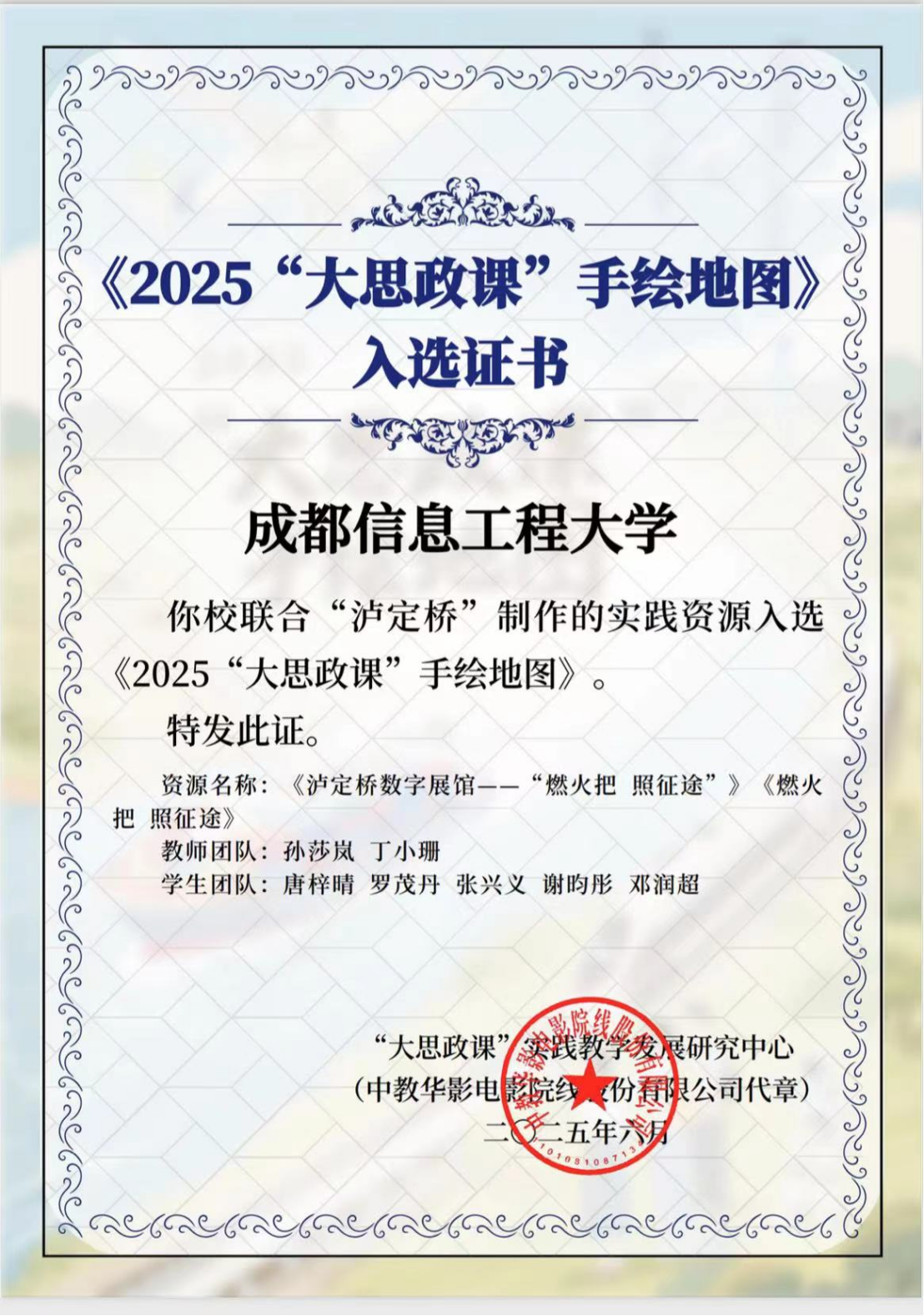 近日,教育部“大思政课”实践教学资源项目结果公示,由我校betway西汉姆联平台教师团队孙莎岚、丁小珊共同指导,由学生唐梓晴、罗茂丹、张兴义、谢昀彤、邓润超联合申报的高校思政课实践教学资源《泸定桥数字展馆——“燃火把 照征途”》从全国众多项目中脱颖而出,成功入选。此次成果是对我校创新思政课教学模式、推动实践育人成效的充分肯定。