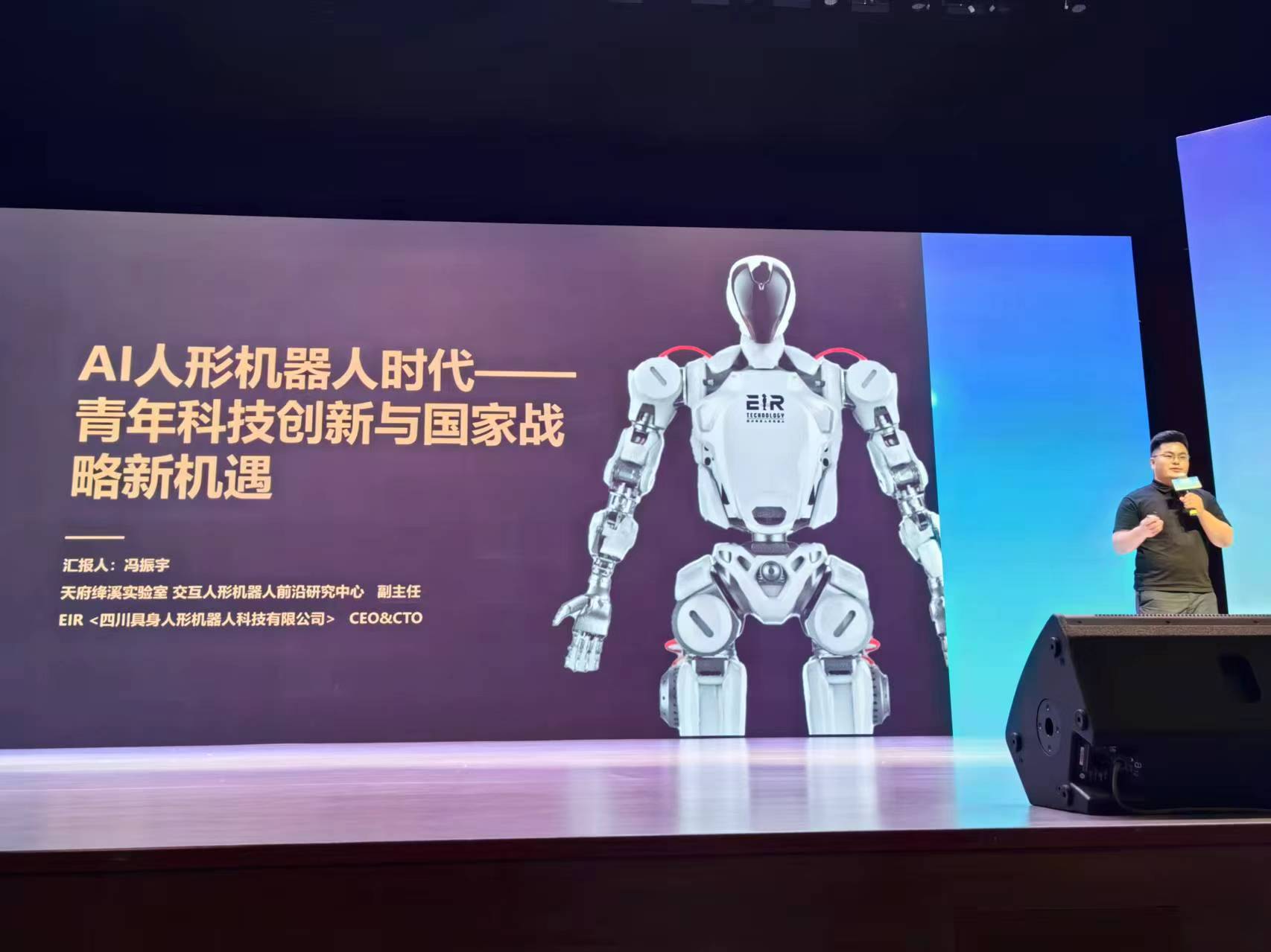 第二场主题宣讲由四川具身人形机器人科技有限公司董事长兼总经理冯振宇主讲,题为《AI人形机器人时代——青年科技创新与国家战略新机遇》。他分析了全球人工智能及机器人技术的前沿动态,阐述了人形机器人产业在国家战略布局中的重要意义,并鼓励青年积极投身科技创新领域,抓住时代新机遇,为成都建设国家未来产业先导区贡献青春力量。